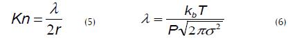 Debido a que en los poros de la membrana se tiene aire proveniente del líquido alimentado que se encuentra cercano a la presión atmosférica, teóricamente solo dos mecanismos pueden estar involucrados en la transferencia de vapor, difusión de Knudsen y difusión molecular, de acuerdo con la teoría cinética de los gases (Thanedgunbaworn et al/., 2007a). El número de Knudsen (Kn) definido por la ecuación (5) es usado como un primer criterio para determinar cuál de los dos mecanismos de difusión puede ser el predominante, comparando la trayectoria media libre (X) de la molécula que se difunde con el radio de los poros en la membrana (Qtaishat et al., 2008).