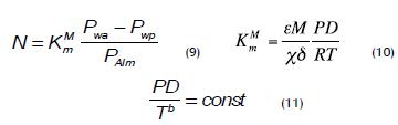 Cuando los poros son grandes, Kn ≤ 0,01, las moléculas de gas colisionan más frecuentemente entre sí, la difusión molecular es considerada predominante (Celere et al/., 2002) y el flujo de vapor puede ser descrito por la ecuación (9), donde PAlm es la presión media logarítmica dentro de los poros y D (coeficiente difusional) es función de la temperatura y la presión (11).