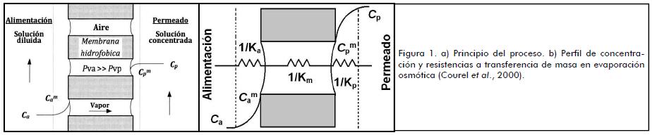 La evaporación osmótica (EO), una de las variantes de la destilación por membranas (DM), utiliza membranas hidrófobas cuyos poros se llenan con la fase gaseosa del fluido que se desea concentrar, lo que previene la penetración del agua, de tal modo que solo los componentes volátiles de la alimentación pueden ser transportados a través de la membrana (Sur et al., 2008). La diferencia de presión parcial de los líquidos que se encuentran separados por la membrana dentro del sistema es generalmente aceptada como la fuerza impulsora, cuyo valor depende de la temperatura y composición de las capas adyacentes a la superficie de la membrana; el gradiente de presión parcial puede formarse por las diferencias de temperatura y concentración (Bui et al., 2004; Gryta et al., 2005; Ravindra et al., 2008; Shen et al., 2008).