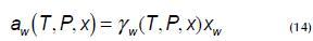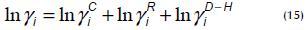 The activity coefficient is calculated using a combination (ln giC) considering each group's shape and size and a residual (in giR) that adds steric interactions between all the groups present in the liquid. In the case of the saline solution, a term (ln giDH) is added to equation 15 representing the effect of electrostatic or Debye- Huckel theory interactions (Correa et al., 1997):