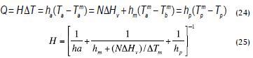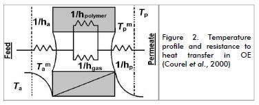 The OE process is considered isothermal, provided that there is no temperature difference across the membrane. However, due to the latent heat from phase change occurring in the walls, evaporation results in a slight cooling of food, and condensation heats the brine; mass transfer is thus associated with heat. The resulting temperature difference causes decay of the vapour pressure gradient, with consequent reduction in driving force (Courel et al., 2000). Figure 2 shows heat transfer mechanisms as a set of resistances and a temperature profile in average conditions; expressions (24) and (25) represent the heat balance in the system's different compartments and total coefficient, respectively.