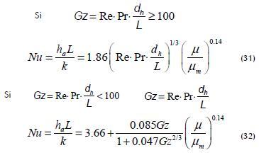 The convective heat transfer coefficient (ha) within hollow membranes can be quantified by analogy with the flow in a pipe, applying the Sieder-Tate and Hausen models defined by equations (31) and (32), which make use of the Nusselt number for calculating this parameter (Martínez-Díez et al., 2000):