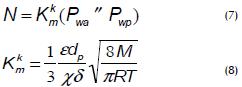 When the pores are large, Kn < 0.01, the gas molecules collide more frequently with each other, molecular diffusion is considered predominant (Celere et al/., 2002) and vapour flow can be described by equation (9), where PAlm is the logarithmic mean pressure within the pores and D (diffusion coefficient) is a function of temperature and pressure (11):