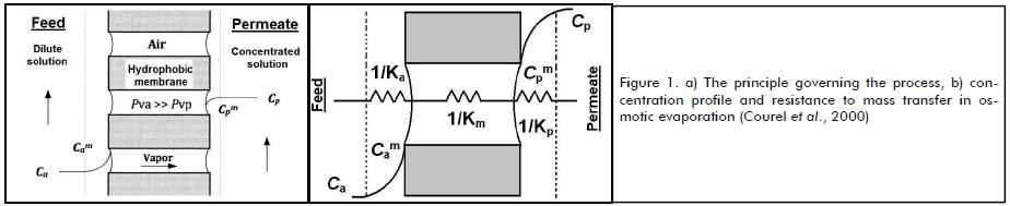 Osmotic evaporation is a modification of traditional processes using membranes; by means of a vapour pressure differential, produced by a highly concentrated extraction solution, water is transferred through a hydrophobic membrane as vapour. This technique has many advantages over traditional processes, allowing work at atmospheric pressure and low temperatures, this being ideal for heat-sensitive products. This paper presents and synthetically analyses the phenomena of heat and mass transfer which occurs in the process and describes the models used for estimating the parameters of interest, such as flow, temperature, heat transfer rate and the relationships that exist amongst them when hollow fibre modules are used, providing a quick reference tool and specific information about this process.