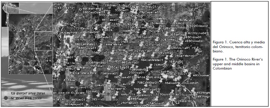 The virtual stations used in this study were drawn from ALTICO, a database developed by the Universidad Nacional de Colombia in Palmira, containing about 550 Envisat virtual stations located on major Colombian waterways, lakes, dams and flood areas (Leon et al., 2009b). These virtual stations show time series regarding the variation in free surface water levels for a period between 2002 (mission start date) and 2008 (the date for which records were updated for the currently operating mission), measurement records being taken every 35 days (Leon et al., 2008).