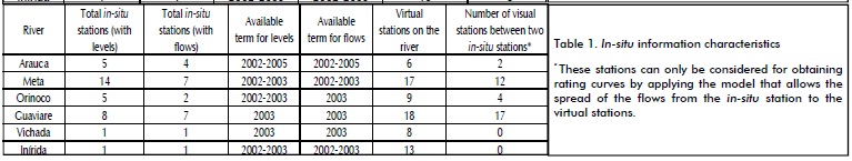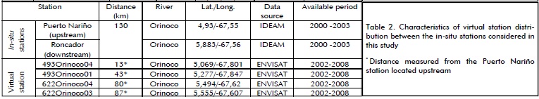 This study then focused on 4 of the 9 stations present on the Orinoco River: 493Orinoco04, 493Orinoco01, 622Orinoco04 and 622Orinoco03. The reason for selecting these stations was because they are located between two in-situ hydrometric stations which have complete records of levels and flows between 2002 and 2003, this being which they represent. The total section considered was about 130 km of the Orinoco's main channel. Table 2 summarises the characteristics regarding space distribution of the virtual and in-situ stations on the section being considered.
