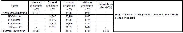The MC model was used for estimating virtual stations' average daily flows. Table 3 summarises the results of applying the model between the Puerto Nariño and Roncador stations for deriving flows in the four virtual stations included in the study.