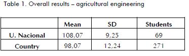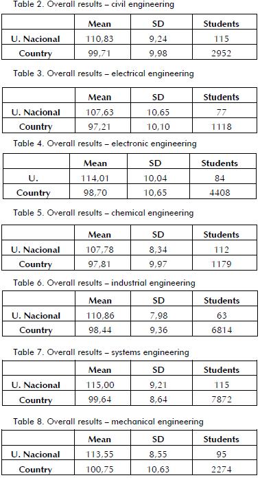 The number of students evaluated and their assigned scores' means and standard deviations for each programme and throughout Colombia (Tables 1 to 8) provided an overall picture of the results obtained by Universidad Nacional Faculty of Engineering students in Bogota on the ECAES 2009 test. It should be pointed out that countrywide data also contained information for the whole of the Universidad Nacional in Bogota.