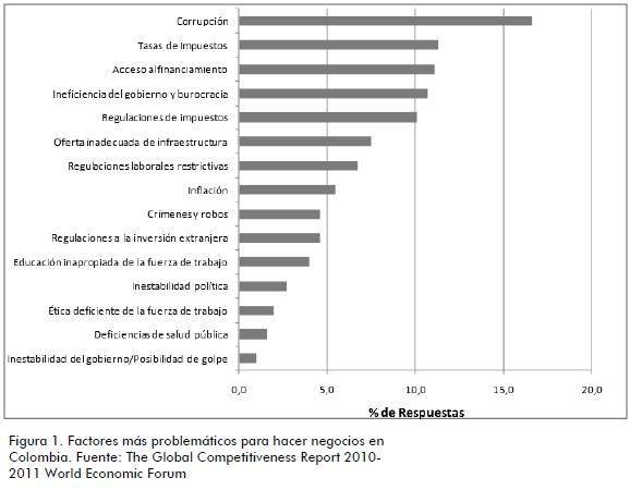 Por otro lado, el Foro Económico Mundial en su informe 20102011 señala como los principales problemas del ambiente para hacer negocios en Colombia, en su orden: la corrupción, las tasas de impuestos, el acceso al financiamiento, la burocracia y la ineficiencia del Gobierno, las regulaciones de impuestos, la oferta inapropiada de infraestructura, las regulaciones laborales restrictivas, la inflación, las regulaciones sobre inversión extranjera, delitos y robos, educación inadecuada de la fuerza de trabajo, inestabilidad política, bajos niveles de ética en los trabajadores, deficiente salud pública y finalmente, inestabilidad del Gobierno (Figura 1).