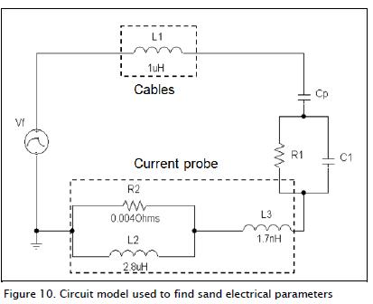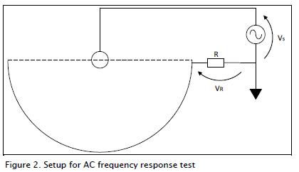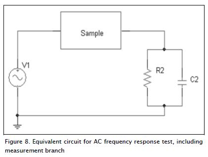A series resistance was used in the AC frequency response test for computing the current. Figure 8 shows the equivalent circuit representing the setup used here.