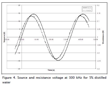 20 Hz up to 3 MHz sinusoidal waveforms were used; a resistance located in series with the setup was used to measure the current. Resistance value was 94.2Ω; it was built with eleven re-sistances in a cylindrical configuration to reduce inductive effects. Source voltage Vs and voltage over resistance VR were meas-ured with an oscilloscope (Figure 2).