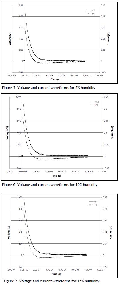 Figures 5, 6 and 7 show voltage and current waveforms when Schaffner generator output voltage was fixed at 1kV for the three aforementioned humidity values.