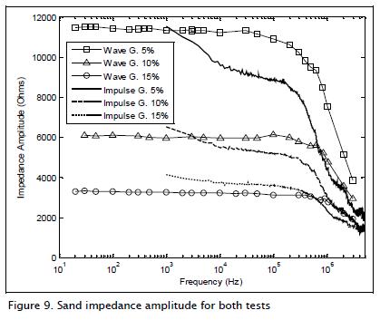 Non-linear impedance of sand was found due to ionic polarisation on the surface of test electrodes. This conclusion was reached due to the differences between results from wave generator and impulse generator tests.