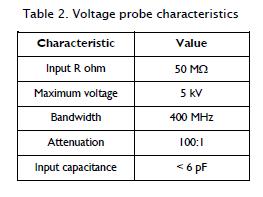 A voltage probe (Lecroy PPE 5kV) was used to measure the impulse voltage. Table 2 shows this probe's average characteristics.