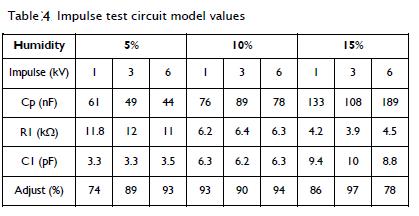 Matlab toolbox system identification was used to find a transfer function F(s) for each voltage (V) and current (I) couple to com-pute R1, C1 and Cp parameters. Table 2 presents the results for three peak voltage values and three humidity values. The item "Adjust" in this table means how transfer function response fit experimental result in terms of percentage.