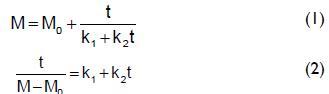 The first constant is inversely related to the speed at which water absorption by the seed occurs, while the second constant is related to its ability to absorb water. If time goes to infinity, equation (3) shows the expression for equilibrium moisture content, dry basis (Me):