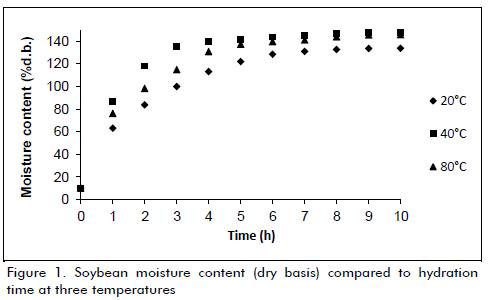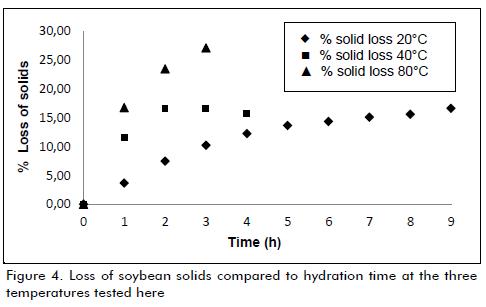 A completely randomised block design was used, involving three treatments using 20°C, 40°C and 80°C soaking temperature. 10 steel containers were taken for each test containing 100g of soybean and 300 of water at the test temperature; one container was taken each hour, over a 10-hour period. The variables measured were grain weight, the weight of the remaining liquid and its solid content (dry matter content by gravimetric method using oven drying at 103°C forced air until constant weight, according to AOAC method 952.10, 1998).