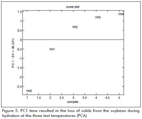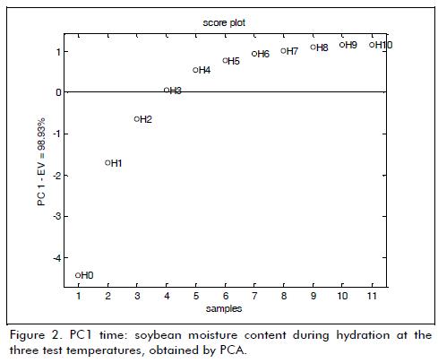Maximum water uptake occurred after 8 hours at 40°C when it reached 147% moisture; this value was greater than that reported by other authors (Pan & Tangratanavalee, 2003) (140%) and (Chopra & Prasad, 1994) (129%). The soybeans in the present study absorbed more water and faster at 40°C than at 20°C. However, at 80°C the proportion of water absorbed and the rate of hydration was lower than the rate at 40°C. This result did not agree with that reported by other authors for wheat starch (Sopade & Okonmah, 1993); this might have been due to special aspects regarding soybeans' chemical composition as protein content was quite high and starch was virtually zero. Figure 2 gives the PCA results, taken every hour; samples were compared to the first component and showed the overall hydra-tion kinetic profile, having a typical saturation form. 98.9% variance was explained by the first main component and the first four hours had the greatest variance.