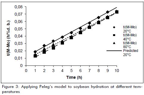 According to Peleg's model, initial seed moisture (Mo) has an effect on hydration kinetics. In real terms, some studies recommended harvesting soybeans having 13% and 15% moisture content when plant foliage has begun to dry out; seeds should then be dehydrated at 60°C to reach 9% to 10% moisture content (equivalent to 10% and 11%, dry basis). If moisture content is above 15%, then seeds deteriorate very quickly whereas if moisture content is less than 13% when soybeans are harvested, then seed pods tend to open, facilitating grain contamination. If the seeds' moisture content is too low (below 10% on harvesting) the soybeans tend to crack and therefore the quality indexes and price drop (Iowa State University, Univerity Extension, 2008). Peleg's model would thus only apply to initial moisture values between 10% and 11% in the case of soybeans, thereby providing practical versatility. Figure 3 shows the actual results which could be predicted by applying Peleg's model.