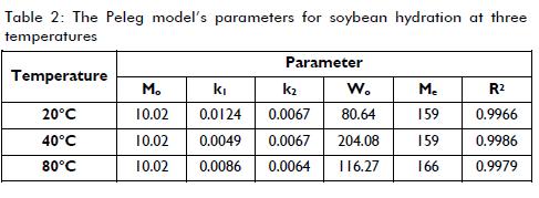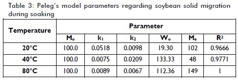 Table 3 shows the model's parameters and the correlation coef-ficient for each temperature. The value of k1 at 20°C was greater than at 40°C, whereas such value was intermediate at 80°C. The behaviour of the inverse of this constant, defined as the initial specific rate of solid loss, was similar to that of hydration; it was observed that the initial rate at 40°C was the highest and that the value was different than that expected at 80°C. Chemical changes in seed cuticle and cotyledon are probably important at this temperature, thereby preventing solid departure. By contrast, 40°C leads to these components' easy hydration and promotes solute migration into the soaking water.