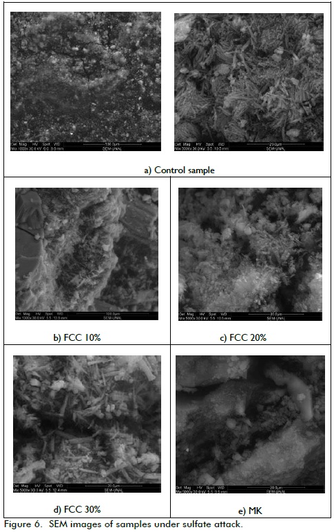 Additionally, the microstructure of samples subject to sulfates attack, after 360 days of exposure was examined, by means of Scanning Electron Microscopy (SEM) on a FEI Quanta 200. Figure 6 shows images of the control sample and the samples added with FCC and MK. It can be seen the formation of ettringite and cracking of control sample, indicating poor behavior. On the other hand, little amounts of ettringite showed up on added samples, indicating better (good) performance and that the sulfate concentration used did not generates significant deterioration, for the times of exposure used.