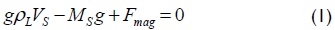 (Vs) is reference object volume, (ρL) is the density of the liquid to be measured, (Ms) is reference object mass, (g) is local gravity acceleration and (Fmag) is the magnetic force needed to levitate the reference object.