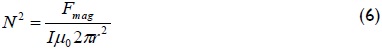 The force acts on magnet moment m, in the presence of a mag-netic field B; this force is proportional to m times B. For a core of air in a coil, B is proportional to current I in the coil and for radius r, the force is given by (Bignell, 2006):