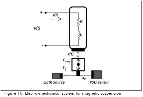 The electric representation of a magnetic suspension system is shown in Figure 10; the position of an object to be levitated was identified by an optical system where the signal was used as feedback for the control system. Coil inductance varied with the object's position; the current passing through the coil could change the magnetic force generated by the coil, thus allowing the object to fluctuate when being levitated. In Figure 10, i (t) is the circuit's current, x (t) is the object's displacement produced by means of the electromagnet and x0 is the desired position.