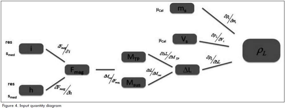 There are two possibilities for evaluating the degree of dependency between input quantities regarding measured liquid density; a numerical simulation (JCGM: 101, 2008 ) may be done or partial derivatives of liquid density may be calculated regarding each input quantity (JCGM:100, 2008 ) and the data then being organised in a table as the uncertainty budget. The input quantities diagram is shown in Figure 4, where ρL is liquid density, Ms and Vs are reference object mass and volume (solid density standard), ΔL is the difference between balance readings for MTP and Muss, MTP is the balance reading in tare position, Msus is.the balance reading where the reference object is hung up, Fmag is the necessary magnetic force for hanging up the solid, i is the current applied to the coil and h is the height difference between the coil core and the hanging reference object when submerged in the liquid.
