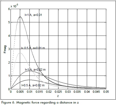 where, B (z, r) is the partial derivative regarding z from equation (7). Figure 6 shows a simulation of magnetic force with different current values and coil radius.