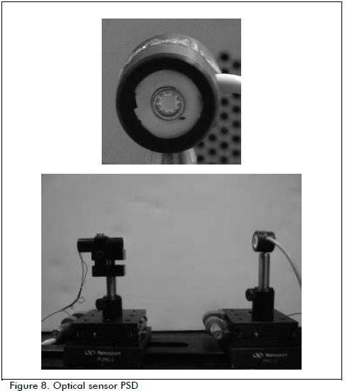 The position would be measured by total cell illumination and a light beam interrupting means involving an anodised board having a 0.5 mm wide slot. Figure 8 shows optical system assembly. Scanning every 50 µm (680 nm wave length laser) from top to bottom and vice versa characterised the PSD's optical area (Figure 9); the response was not totally linear.