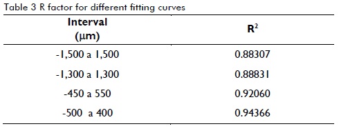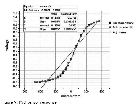 Table 3 shows that the best fitting linear area came within the -500 µm to 400 µm interval; a 1 mV/10 µm resolution was obtained in this interval. This resolution was appropriate according to the results of the sensitivity stability study for the system.