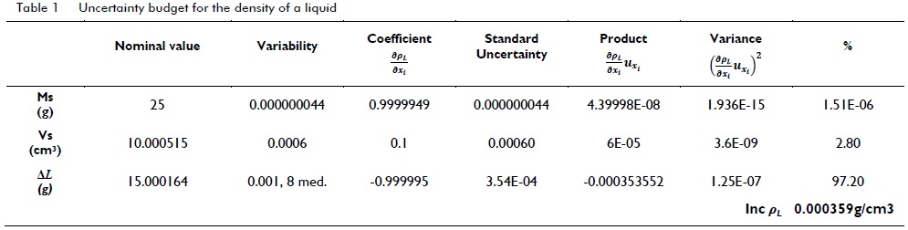 Table 1 gives the uncertainty budget ( JCGM: 100, 2008 ) for determining liquid density.