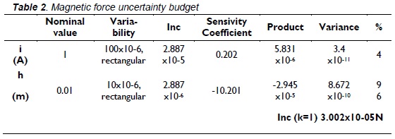 Assuming 1 A maximum current (i), the object to be hung up positioned 1 cm from the coil core (h) and 10 µm variability at this height, then the uncertainty budget will be as follows: