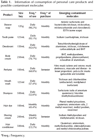 On the level of personal care products, the people interviewed were asked about the frequency of use, amount and purchase frequency. From the answers, it was possible to recognize that the daily use of ten personal care products and their emergent contaminant molecules are probably discharged in domestic wastewaters (Table 1).