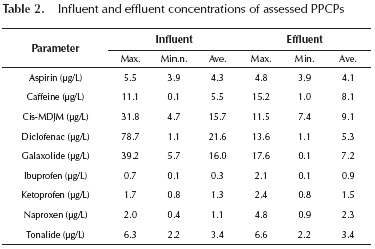 The compounds that present higher average concentrations in the treatment system are diclofenac (21.6 μg/L), methyl-dihydrojasmonate (15.7 μg/L) and galaxolide (16 μg/L). The remaining group of assessed compounds presents concentrations below 6 μg/L. For all PPCPs evaluated, the removal efficiencies may be estimated as low. Comparing influent and effluent concentrations (Figure 1), the removal rates were below 50 % for compounds such as methyl-dihydrojasmonate, diclofenac and galaxolide; below 15 % for aspirin, naproxen and tonalide, and no removal rates for caffeine, ibuprofen and ketoprofen. This fact agrees with the information reported by other authors in which conventional treatment systems do not have a wide removal capacity for this type of emerging contaminants (Suarez et al., 2008; Dordio et al., 2010).