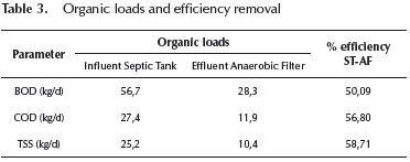 On the topic of organic matter parameters used to assess the wastewater treatment systems operation, the arrangement of septic tank and anaerobic filter units in this research displayed an efficiency removal higher than 50 % for CDO, BOD and TSS, as presented in Table 3. These data represent a low efficiency in this kind of systems treatment since the typical percentage for organic matter removal in this combination units is reported between 80 and 90 % (Sperling, 2012).