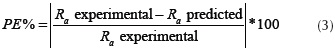 To check the second order regression model which measures roughness average, four further tests were conducted to compare roughness recorded from experiments with estimated roughness by means of percentage prediction error (PE%). The Equation (3) was used: