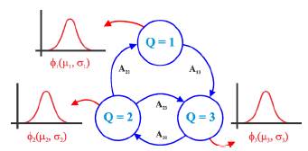 Markov modeling requires a periodic acquisition of T measurements, where each measurement is assumed to be associated with a state Q from de process, and each state of the process can assume one of N possible values. HMM have a three component structure. A Transition A matrix containing the state-transition probability values; each state probability φ, and a vector with the values of the initial state occupation probabilities π. Figure 6 shows the structure of a HMM for a device with only three states (Mueller & Kimball, 2016).