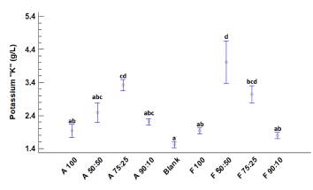 With a multiple range contrast test (Tukey) and a Matt-Whitney test, it was determined that treatments F 50:50, F 75:25, and A 75:25, had the highest concentrations of K in comparison with the other treatments, as seen in Figure 6. Equal letters mean similarity between groups, but all treatments tend to be older than the witness treatments.