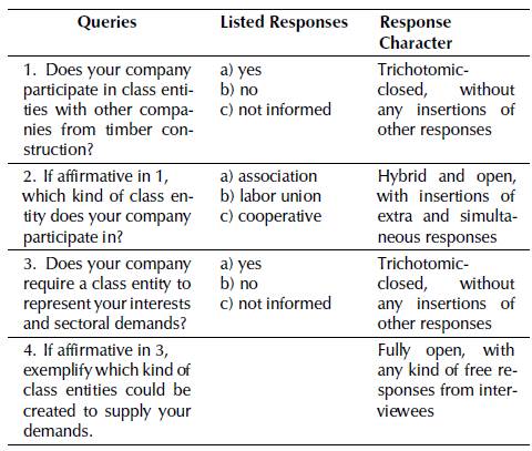 This study consisted of a survey aiming reveal the real and current situation of the timber house production sector with respect to their representatives and class entities in Brazil. Four questions were formulated for the sampled population to characterize the context in question. The approach and application were in charge of the research manager (first author) and his advisor (last author), with formal support of some researchers from the construction and timber fields (co-authors). A semi-structured questionnaire was created, and its queries are cited and explained in Table 1.