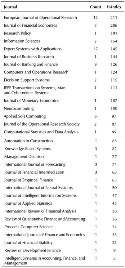 The journals considered for this analysis can be found in Table 2, and their h-index was collected to illustrate their impact. Analyzing this table, we are able to observe that 12 out of 31 journals have an h-index over 100, and the average of the presented journals was around 90.