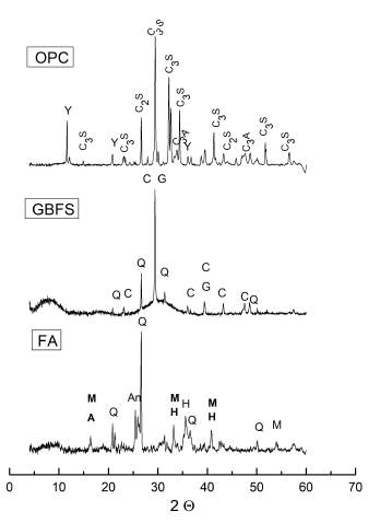 The XRD diffractograms of the materials used in this research (OPC, GBFS, and FA) are presented in Figure 1. Regarding the OPC, crystalline phases proper to this kind of cement were found: tricalcium silicate (C3S), tricalcium aluminate (C3A), dicalcium silicate (C2S), and gypsum (Y). As for the blast furnace slag, crystalline phases were observed such as calcite (C), quartz (Q), and gehlenite (G), as well as an amorphous halo between 22-36° 2p. Fly ash reported the presence of Q, Mullite (M), hematite (H), anhydrite (A), and analcime (An), without any evidence of an amorphous phase.