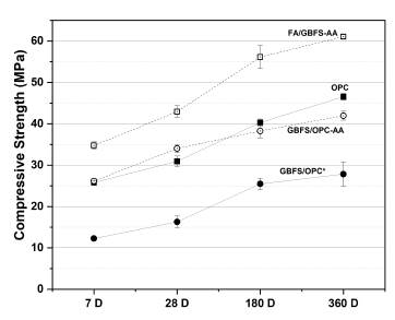 Figure 2 shows the average compressive strength values with respect to the curing age of the different concretes that were evaluated in this study, namely, reference concretes (non-activated binders) (OPC and GBFS/OPC*) and alkali-activated concretes, GBFS/OPC-AA and FA/GBFS-AA.