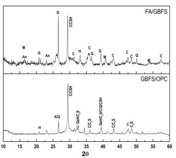 Microstructural analyses of activated alkali systems performed by X-ray diffraction and electron microscopy (SEM) confirmed the presence of C-A-S-H/N-A-S-H gels and the densification of the generated microstructures. The X-ray diffractograms, after 28 days of normal curing of the FA/GBFS and GBFS/OPC systems are presented in Figure 3. The presence of the crystalline phases associated with the original materials, which were not affected by the alkaline solutions, was observed (Mejía, Rodríguez, and Mejía de Gutiérrez, 2014). Hydration products such as gehlenite, hydrotalcite, and a crystalline portion of C-S-H gel were identified in the GBFS/OPC system, the latter of which was also found in the diffractogram of the FA/GBFS system. For both systems, the peak located at approximately 300 20 is attributable to the main phase C-(A)-S-H, which overlaps with that of calcite. A crystalline phase of sodium aluminosilicates (analcime, NaAlSi2 O6H2O) was also identified, thus confirming the presence of a NASH-type binding gel in the FA/GBFS system.