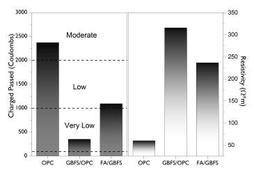 Regarding the resistivity values calculated from the initial current results in this test, it was possible to notice increases in the alkaline-activated concretes of up to 5 times the value reported by OPC (Figure 5). The current results could be indicative of the concrete porosity. However, the connectivity, and tortuosity of the pore network and electric properties of concrete affected the results of this test. Therefore, the electrical conductivity of concrete depends on the pore solution, and the AA concretes present a high ionic concentration because of the presence of mobile cations such as Na+. For this reason, it is only possible to compare concretes with a similar pore solution chemistry (FA/GBFS and GBFS/OPC, both alkali-activated concretes) (Ismail et al., 2013). The highest electrical conductivity presented by the alkaline activated FA/GBFS, compared to the GBFS/OPC, could be attributed to the potentially high conductivity of the pore solution generated in this material, due to the high concentration of Na+ and OH- ions, present as a consequence of higher content of sodium silicate and sodium hydroxide in the mix (see Table 2) (Chi, 2012; Lloyd, Provis and van Deventer, 2010; Ravikumar and Neithalath, 2013). However, according to ASTM C1202, the results obtained of charge passed and resistivity of alkali-activated materials evaluated in the present study were consistent with each other (Figure 5).
