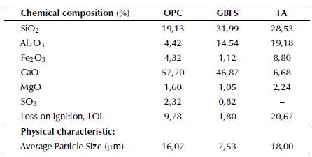 The materials used in this study were fly ash (FA), granulated blast furnace slag (GBFS), and Colombian ordinary Portland cement (OPC) for general use. The chemical composition and physical characteristics of these materials are shown in Table 1. The Portland cement used in this work contains an addition of limestone that is related to the loss on ignition percentage found in the chemical composition. There is also a high loss on ignition (LOI) of the fly ash component (20,67%), a value that exceeds the 6% that the ASTM C618 (ASTM International, 2019) recommends for the use of pozzolanic supplementary materials in mixtures with Portland cement. The blast furnace slag used is basic and features a good hydraulic behaviour, according to the indices established by different authors (Hadjsadok, Kenai, Courard, Michel and Khatib, 2012; Pal, Mukherjee and Pathak, 2003; Puertas, 1993; Tanzer, Buchwald and Stephan, 2015).