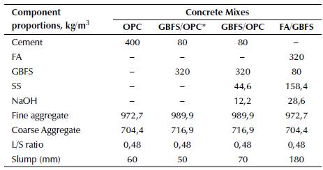 Four types of concrete were manufactured, two as reference, OPC (100%) and GBFS blended concretes (GBFS/OPC* -80/20); and two alkali-activated concretes (GBFS/OPC 80/20 and FA/GBFS 80/20). The activator used was a mixture of sodium hydroxide (NaOH) and sodium silicate (Na2SiO3: SiO2 = 32,09%, Na2O = 11,92%, H2O = 55,99%). The activating solution used in GBFS/OPC concrete featured a solution module (Ms = SiO2/Na2O) of 1 and was incorporated in a proportion of 5% of Na2O according to slag content. In the case of the binary system (FA/GBFS), the components of the mixture were dosed to obtain molar ratios of Si/Al: 3,85 and Na/Si: 0,25. In this mix, the activator moduli Ms was 1,55. The proportions used in FA/GBFS were determined in previous studies (Valencia-Saavedra, Mejia de Gutiérrez and Gordillo, 2018). To prepare the concretes, river sand with a fineness modulus of 3,16 and crushed gravel with a maximum particle size of 12,7 mm were used according to ASTM C39 standards (ASTM International, 2018). The mix design was carried out according to the recommendations of ACI 211 Committee (2009).