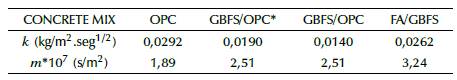 To measure the water absorption capacity of each mixture (capillary sorption), two cylindrical samples (76,2 mm diameter and 76,2 mm height) were used per evaluated mixture, according to the Swiss Standard SIA 162/1 (EMPA, 1989). After 28 days of curing, the samples were dried in a furnace at 60 °Cfor48 hours until a constant weight achieved. Then, the lateral surface of each cylinder was covered with waterproof paint. The samples were placed on a tray in a sealed container, in such a way that the lower surface was in contact with the water up to a height of 5 mm, allowing the water to enter through it. At different times, the samples were removed from the container and weighed to evaluate the weight gain. The kinetics of water absorption in concrete can be described approximately by the coefficients: Water absorption coefficient -K (Kg/m1s1/2) and Resistance to water penetration -m (s/m 1 ). K corresponds to the initial slope of the sorptivity plot (water absorption expressed as Kg/m2 versus the square root of time in s1/2). The value of "m" is calculated using Equation (1):
