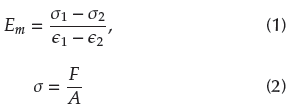 In accordance with ISO 527-2 (1996) regarding the determination of the modulus of elasticity and extensional stress, the following expressions are used: